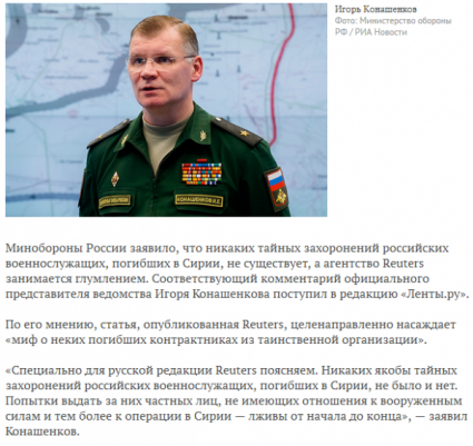 Здесь, - и знаете, просмотрев критикуемую г-ном Конашенковым публикацию Reuters, пребываю в некотором недоумении. Ни о каких "тайных захоронениях российских военнослужащих, погибших в Сирии" там речи нет. Речь идет исключительно о (как говорит сам г-н Конашенков) "частных лицах, не имеющих отношения к вооруженным силам