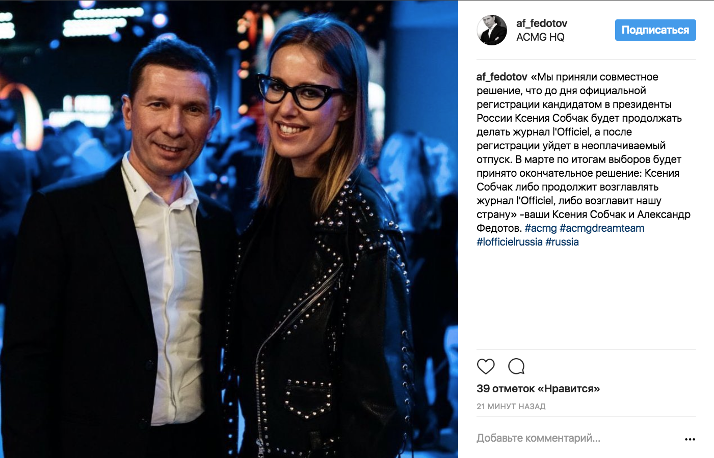 С мая 2012 года по декабрь 2014 года Собчак была главным редактором входящего в "глянцевую империю" Федотова женского журнала SNC (бывш. Sex and the City). Когда в конце 2014 года Федотов приобрёл право на выпуск русскоязычной версии французского журнала о моде LʼOfficiel, он сразу пригласил на пост главного редактора всё ту же Собчак.