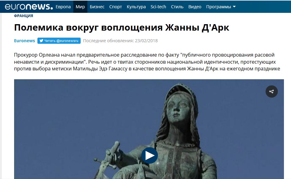 На этот раз "воплощением" Национальной Героини выбрана мадмуазель, не имеющая ни капли французской крови - дочь польки и "гражданина Бенина" (т.е. негра). Конечно, "обезьяной" ее называть явно не стоит - даже в Бенине живут люди, а не обезьяны. Но в контексте очередного прецедента стирания национальной памяти французов - так ли уж "криминально" звучат слова оскорбленных французских националистов?