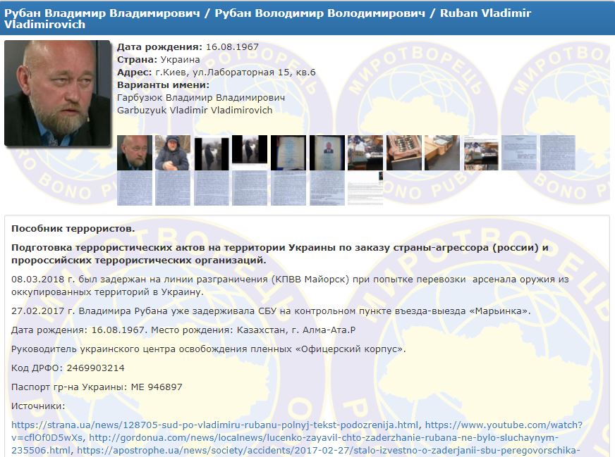Ещё недавно считавшегося героем Рубана сразу внесли в базу нацистского сайта "Миротворец". В качестве "пособника террористов".
