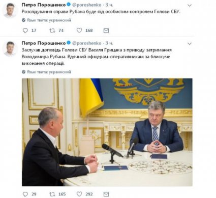 Порошенко высказал благодарность "офицерам-оперативникам за блестящее исполнение операции" и поручил главе СБУ Василию Грицаку взять расследование под личный контроль. Последний, раздухарившись в ожидании медальки из рук собутыльника Вальцмана, уже объявил на брифинге, что "российским оружием" переговорщика снабдили Глава ДНР Александр Захарченко и заместитель председателя Совмина ДНР Александр Тимофеев, что "Рубан, действуя по предварительному сговору с Захарченко и Тимофеевым, а также с другими лицами, спланировали конкретные действия, направленные на подготовку серии террористических актов в центральной части города Киева с применением выше указанного оружия и взрывных устройств". В пафосной речи Грицака фигурировали "тысячи трупов и много крови".