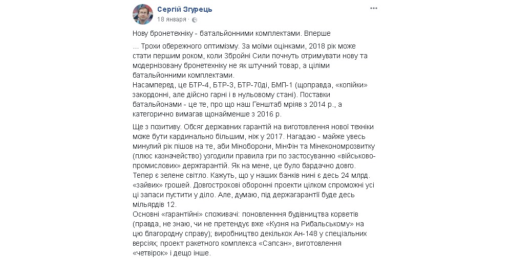 18 января 2018 года Сергей Згурец публикует в Фейсбуке довольно интересную информацию: