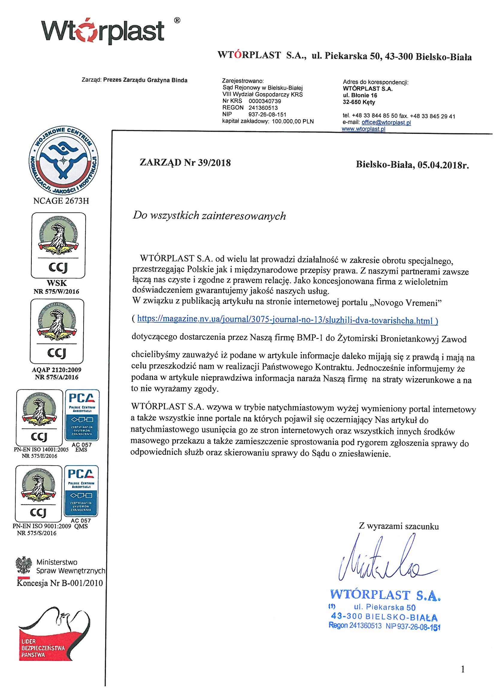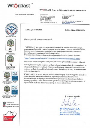 Wtorplast отмечает, что информация, которая была опубликована в статье, не соответствует действительности и имеет целью сорвать важный межгосударственный договор, нанести вред деловой и коммерческой репутации, а также имеет все признаки недобросовестной конкуренции. Компания призывает опубликовать соответствующие опровержения, в противном случае, оставляя за собой право обратиться в суд для защиты своей репутации."
