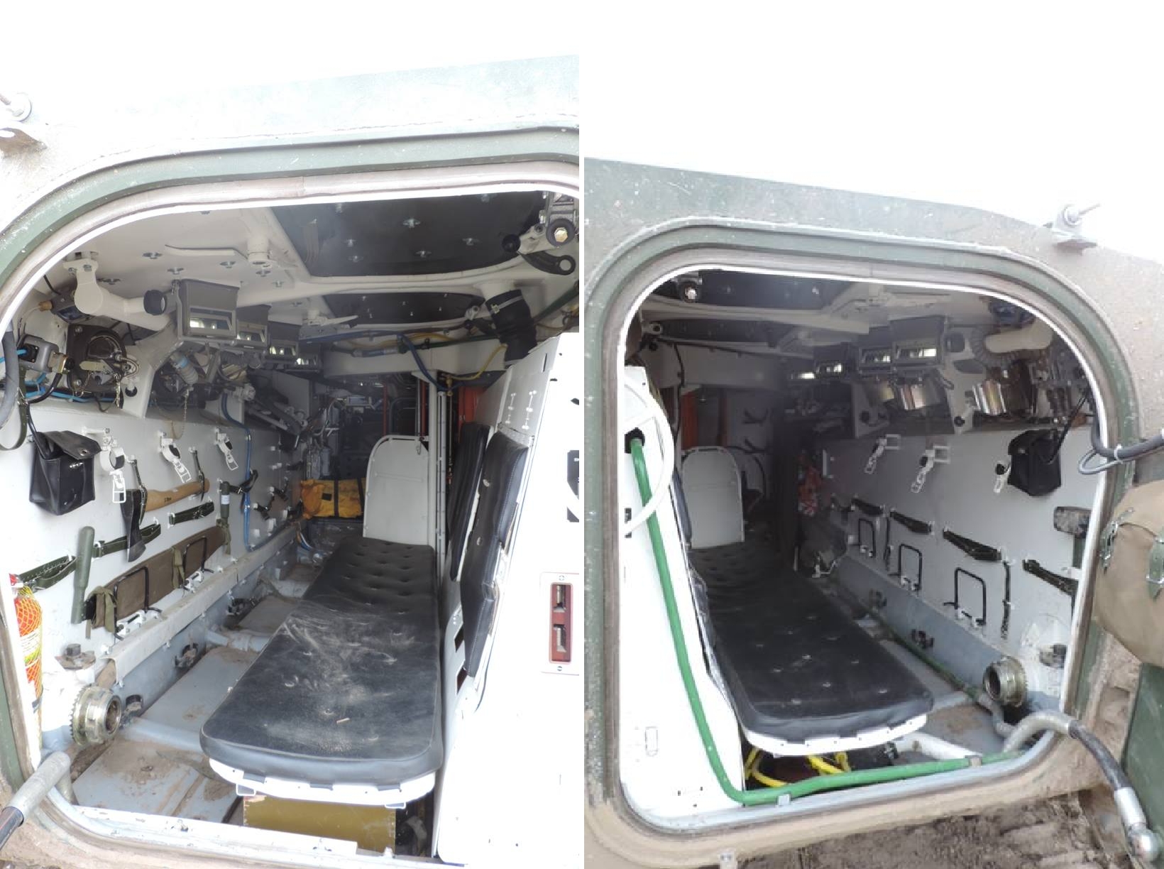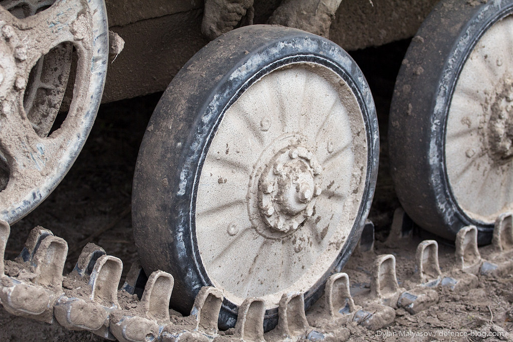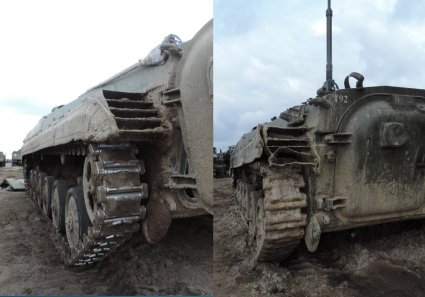 Для сравнения, на БМП-1 (первые две фотографии), откапиталенной на ЖТБРЗ видны "шпоры", используемые для крепления БМП при перевозке ЖД транспортом, установленные, в качестве дополнительной защиты, по левому борту в районе места механика-водителя (на второй фотографии они сняты, но места крепления отчётливо видны), есть надбой на башне: