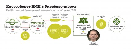Далее ЖБЗ завозил все это по отдельности в Украину: каждая башня оценивалась в $66 тыс., а каждое шасси — по $99 тыс. Завод "ремонтировал" БМП — попросту соединял ранее разобранные части. Стоимость работ составляла еще $40 тыс. за единицу.