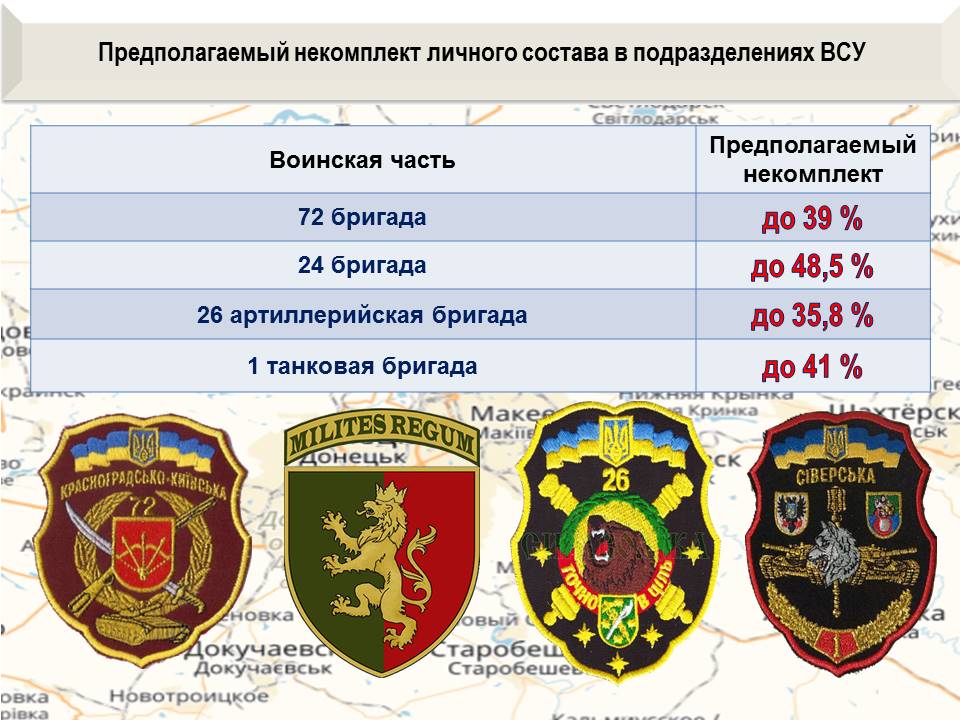 Из полученных данных нам известно, что максимальные сокращения пройдут в 72-й бригаде – до 38,9% от штатной численности, в 24-й бригаде – до 48,5%, в 26-й артбригаде – до 35,8%, в 1-й танковой бригаде – до 41,1%.