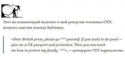 «Дорогая пресса Британии! А иди, пожалуйста, ***, а? А хотите пользы — дайте мне британский паспорт и защиту. Вот тогда и будете меня учить, как спасти свою семью. Умники ***, ***», - написал Бабченко,
