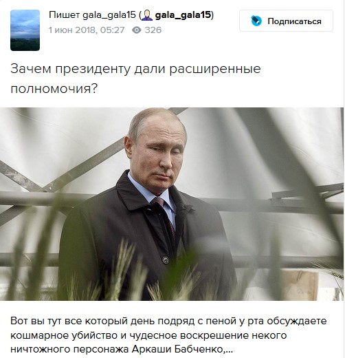 Моя версия хэппенинга как ширмы касалась наделения президента Путина расширенными полномочиями в духе "отныне, что хочу, то и ворочу" и нашла позже множество подтверждений, но, оказывается, это было не единственное событие, которое понадобилось замаскировать, отвлекая от него внимание бурлескным представлением с Бабченко.