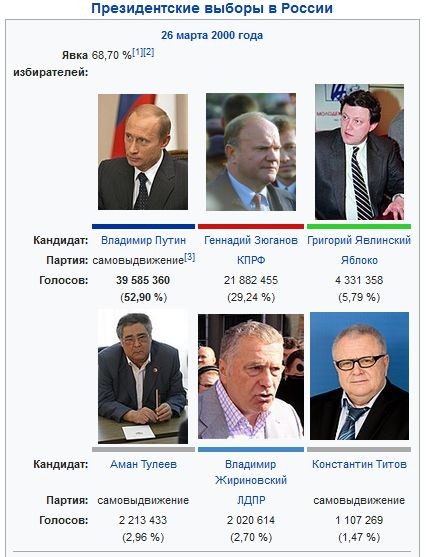 Вот: результаты выборов 2000 года. На фото - участники. И никакого кандидата Е.М. Примакова. Мелочь, набравшая от 1,1% до 0,1%, опущена за ненадобностью, но кандидата Е.М. Примакова нет и там. Потому что в выборах 2000 года, на которых, как утверждает птичка, будущий великий человек "победил этого очень опытного и сильного соперника", Евгений Максимович участия не принимал. Это все, что нам нужно знать о птичке, которая либо не знает элементарного, либо всегда врет, либо и то, и другое вместе, а на случай, если птичка щас сотрет свой позор, скрин сделан.
