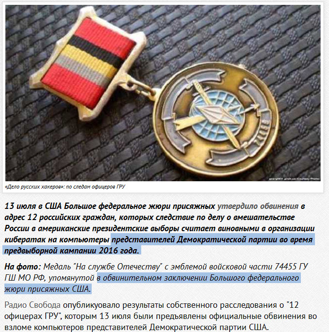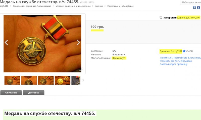 2 июня 2017 года, Кременчуг, Украина, доставка новой почтой. По меньшей мере, удивительно происхождение. Российская награда оказывается в Кременчуге, после идет ссылка на номер части указанной в лоте. И эта же часть 74455 присутствует в обвинительном заключении, вынесенном на основании материалов предоставленных Большому федеральному жюри США. Второе совпадение в таком виде, уже не случайность, тем более лот появился задолго до того как появились выводы жюри, подозрительное совпадение, или закономерность. Слишком много возникает вопросов. И тут одно из двух, или Кременчуг внезапно стал Россией(прошляпили), но так нет же. Или как говорят, свяжись с безумными идиотами в помойке, заболевание передалось(заразились). В этом случае Вестник серьезно и настоятельно рекомендует составу Большого жюри как можно записаться на прием к хорошим психологам и психиатрам(в индивидуальном порядке). Ибо ежели базис появился в помойке, задолго до того, как появилось обвинительное заключение в США...