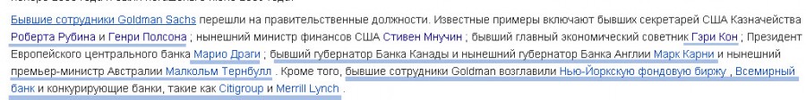 Многие из выходцев сего банка кружатся не только на Уолл-Стритт, но и занимали довольно высокопоставленные кабинеты в правительстве США, список действительно впечатляющий: