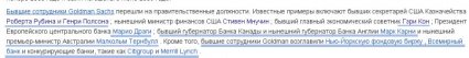 В списке немало интересных фамилий и компаний: Robert Rubin: United States Secretary of the Treasury during the Clinton administration. Before his government service, he spent 26 years at Goldman Sachs, eventually serving as a member of the board and co-chairman from 1990 to 1992. During the Clinton administration, Rubin oversaw the loosening of financial industry underwriting guidelines which had been in place since the 1930s.