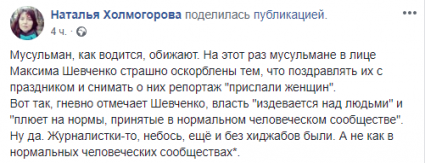 "...В Духовном управлении мусульман Владимирской области рассказали, что не видят ничего плохого в присутствии женщин на празднике. «Это Елена Владимировна Анисимова, глава комитета общественных связей и проектов [администрации региона]. Она приходит каждый год и поздравляет верующих. Это нормально. Конечно, желательно, чтобы женщины, которые заходят в мечеть, были покрыты. Но по-моему, все были в платках», — объяснил имам-мухтасиб Азат хазрат Мунавиров. По его словам, в мечети отдельные молельные залы для мужчин и для женщин. «Но сегодня торжественная часть была в мужском зале, поэтому Елена Владимировна и журналистки тоже были там», — добавил представитель управления"