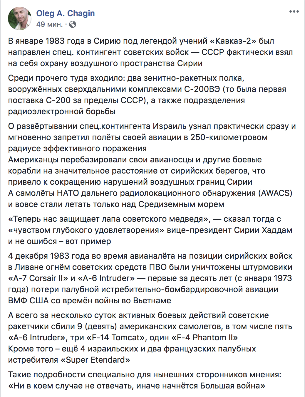 «Теперь нас защищает лапа советского медведя», — сказал тогда с «чувством глубокого удовлетворения» вице-президент Сирии Хаддам и не ошибся – вот пример.