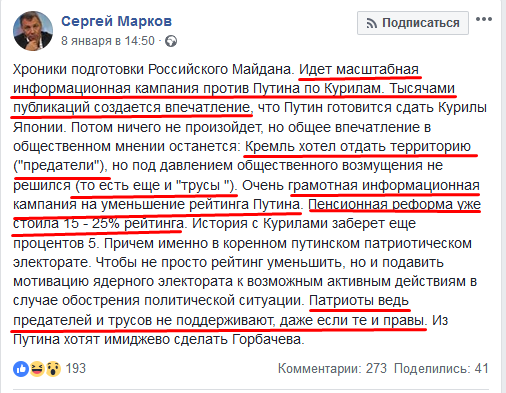 Хроники подготовки Российского Майдана. Идет масштабная информационная кампания против Путина по Курилам. Тысячами публикаций создается впечатление, что Путин готовится сдать Курилы Японии. Потом ничего не произойдет, но общее впечатление в общественном мнении останется: Кремль хотел отдать территорию ("предатели"), но под давлением общественного возмущения не решился (то есть еще и "трусы"). Очень грамотная информационная кампания на уменьшение рейтинга Путина. Пенсионная реформа уже стоила 15 - 25% рейтинга. История с Курилами заберет еще процентов 5. Причем именно в коренном путинском патриотическом электорате. Чтобы не просто рейтинг уменьшить, но и подавить мотивацию ядерного электората к возможным активным действиям в случае обострения политической ситуации. Патриоты ведь предателей и трусов не поддерживают, даже если те и правы. Из Путина хотят имиджево сделать Горбачева.