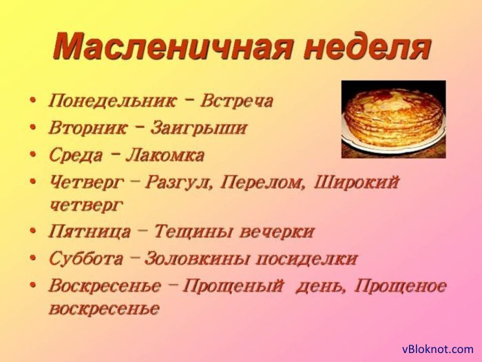 Масленица получила свое название от того, что в последнюю неделю перед Великим постом, разрешается употребление в пищу сливочного масла, молочных продуктов и рыбы. В календаре Русской православной церкви этот период называется Сырной седмицей, — неделя (седмица), следующая за Пёстрой неделей. В православной церкви считается, что смысл Сырной седмицы — примирение с ближними, прощение обид, подготовка к Великому посту — время, которое нужно посвятить доброму общению с ближними, родными, друзьями, благотворению.