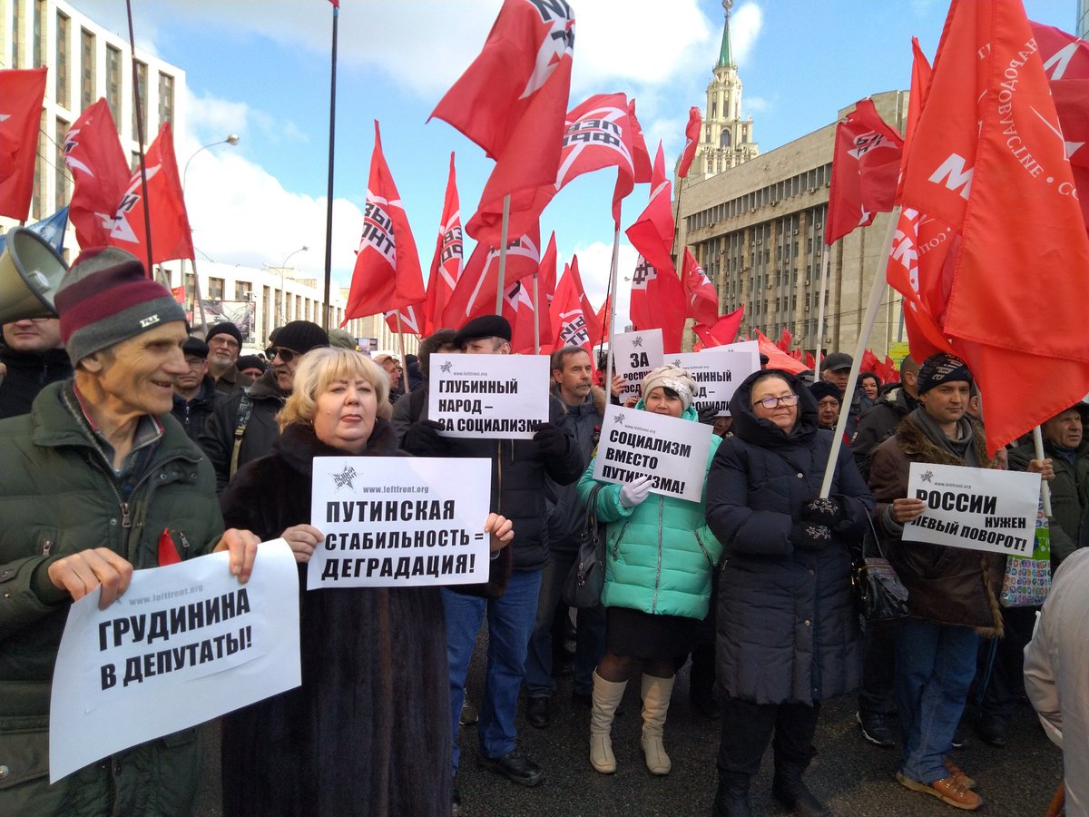 Перед началом митинга члены КПРФ, ЛФ, представители профсоюзов, сторонники формирующегося движения "Новый социализм", троцкисты из Революционной рабочей партии и др. прошли по проспекту Сахарова, скандируя "Руки прочь от Грудинина!", "Нам нужна народная власть!", "Хватит грабить Россию!".