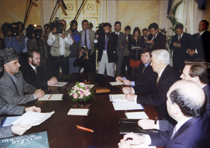 В середине 1997 года отношения между Россией и непризнанной Республикой грозили потерей статуса-кво. Подписанный в Кремле договор о мире 12 мая прошел незамеченным, кажется, ни для кого, кроме подписавших его. Масхадов приехал в Москву в августе, чтобы добиться от Ельцина установления дипотношений. Он предложил проект широкомасштабного договора, по которому Чечня должна была быть признана независимым государством. Если бы Россия признала в тот момент Чечню, в дальнейшем она бы выглядела агрессором при любых действиях, направленных на усиление безопасности границ с Чечней.