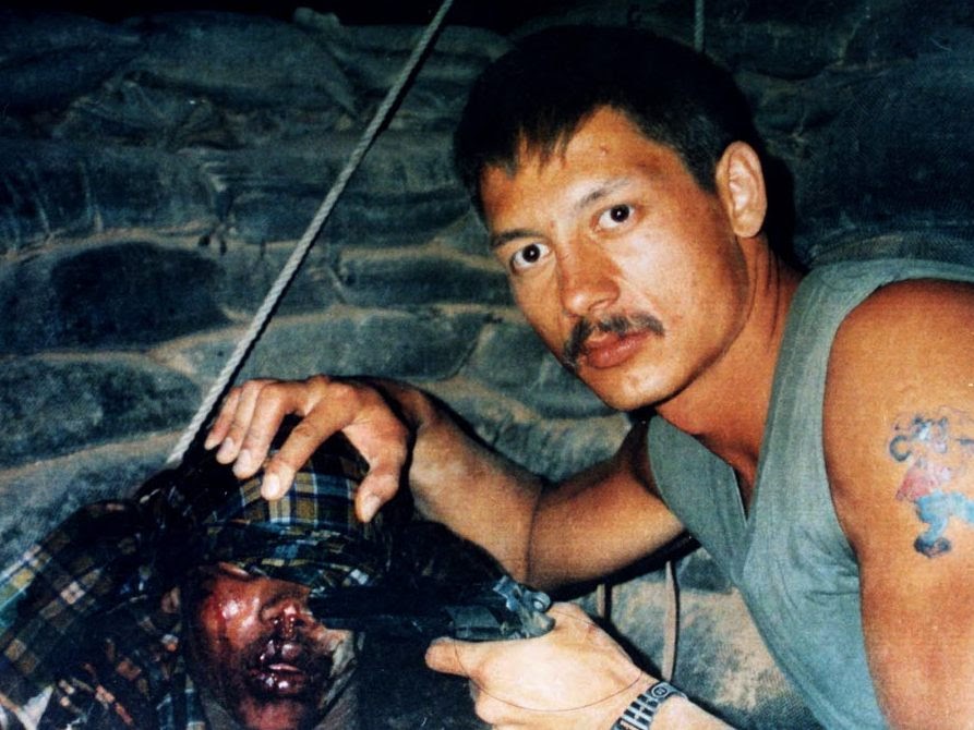 Мастер капрал Клейтон Мэтчи держит пистолет у головы 16-летнего Шидана Абукара Ароне, 16 марта 1993 года. когда Ароне был связан и истекал кровью в бункере на базе Канадского воздушно-десантного полка (Canadian Airborne Regiment -CAR) в Беле-Хуэн, Сомали. Позже Ароне скончался от полученных травм. (Фото опубликовано Сомалийской комиссией по расследованию).