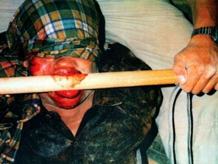 Мастер капрал Клейтон Матчи держит дубинку во рту 16-летнего Шидана Абукара Ароне, 16 марта 1993 года, когда Ароне был связан и истекал кровью в бункере на базе Канадского воздушно-десантного полка (Canadian Airborne Regiment -CAR) в Беле-Хуэн, Сомали. Позже Ароне скончался от полученных травм. (Фото опубликовано Сомалийской комиссией по расследованию)