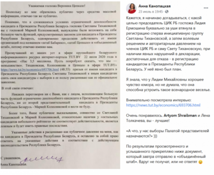 Прежде всего, пояснение к скринам. Анна Канопацкая - минская бизнес-вумен и кандидат в президенты. Шансов у нее, как я понимаю, не так много, но какие-то процентики она у обоих основных кандидатов отнимает, - и штаб "трех граций" публично призвал её снять свою кандидатуру и стать четвертой. А г-жа Канопацкая