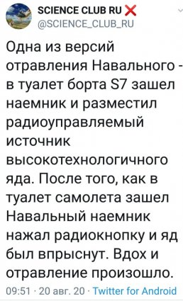Журналист Андрей Медведев: "Отравление в российской оппозиции это такой местный формат metoo. После Скрипалей об отравлении спецслужбами заявляли: Петя Верзилов — скорее всего, перемудрил с наркотиками, буквально через пару недель после «отравления» уже светился с водочкой в инстаграме, обещал представить железные доказательства отравления, но так и запамятовал. Дмитрий Быков (в миру Зильбертруд) — на гастролях переусердствовал с водочкой и жирными закусками, заработал предынсультное состояние или даже микроинсульт, заголосил об отравлении, был спецбортом отправлен в Москву, следов отравления так и не нашли. Теперь вот очередь Алексея нашего Анатольевича".