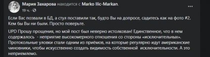 1. Для Захаровой это уже не первый прокол, когда ее "частное мнение" в Фейсбуке затрагивает государственные вопросы, после чего приходится оправдываться (как это было в истории "Сталин хуже Гитлера"). Это выглядит не профессионально, безотносительно личной позиции Захаровой по тем или иным вопросам.