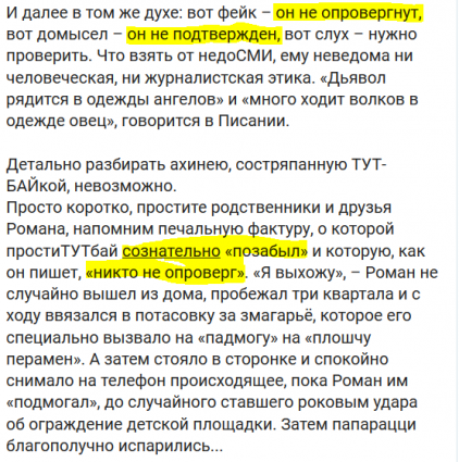 Ага. За неимением новой "сакральной жертвы", продолжаются танцы с бубном над телом Романа Бондаренко, получившего травму в драке, которую он же и затеял. Чтобы хоть как-то уменьшить отток понемногу начинающих думать "невероятных". И поскольку в борьбе за это все средства хороши, ложь перестает быть изящной: