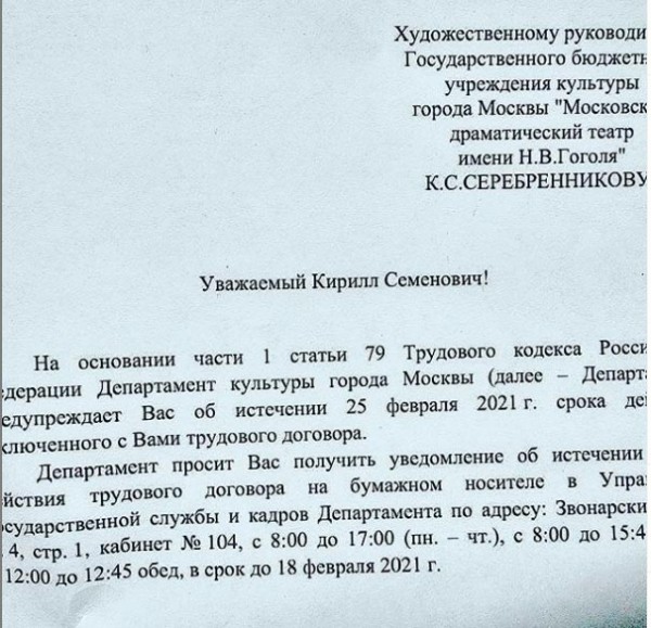 51-летний режиссёр Кирилл Серебренников разместил в Instagram фотографию уведомления от Департамента культуры Москвы и попрощался: "Всё в этом мире, начавшись, заканчивается. Но начинается что-то новое. Я благодарю друзей, учеников и врагов за уникальный опыт, который помог мне разобраться во многих важных вещах. Гоголь-центр как театр и как идея продолжит жить. Потому что театр и свобода важнее и шире, а, значит, и живучее, всевозможных чиновников, обстоятельств и даже важнее и шире их создателей. Постарайтесь сделать так, чтоб театр оставался живым, а свобода была необходимой для вас. И не надо унывать. В унынии нет ни жизни, ни свободы. Вы знаете, что надо делать. Всем — мир и любовь".