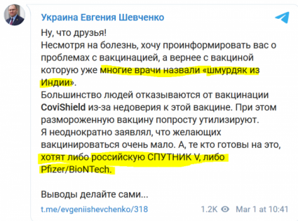во-вторых, тем, кто отказывается от вакцинации "шмурдяком из Индии", требуя "Спутник-V", следует выписывать подозрение в "государственной измене", поскольку "Спутник-V" разработана в РФ, а закупать ее для бУ строго запрещено амбасадой США,