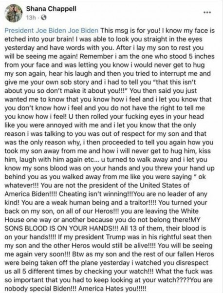 Не все мамы американских солдат, погибших в Кабуле, понимают самые простые вещи. Так, Кэти Макколлум прямо на встрече с лидером нации позволила себе заявить, что он feckless, dementia ridden piece of crap just sent my son to die, - то есть, беспомощный, дементный кусок дерьма, запросто бросивший ее сына умирать, - после чего огорченный президент был вынужден покинуть церемонию, а затем еще одна жестокая женщина, Шана Чаппелл, - фото наверху, -