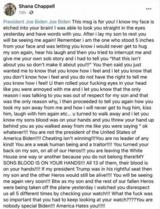 посмела пойти еще дальше. Она не успела сказать все, что хотела, ибо м-р Байден убежал, и потому со злости накатала длинный текст в Instagram и FB (скрин под фото), где, в частности, заявила: "Ты не президент США, Байден! Мошенничество - не победа! Ты вовсе не лидер! Ты слабак и предатель!.. Будь мой президент - Трамп - на посту, принадлежащем ему по праву посту, мой сын и другие герое были бы живы. А ты ничто, Байден! Америка ненавидит тебя!"