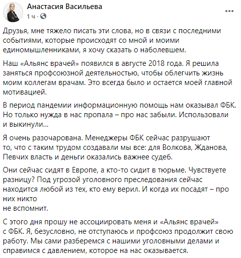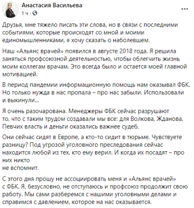 Но пресс-секретарь "Альянса врачей"* Александра Захарова сообщила журналистам, что страница не взломана и что пост написан именно Васильевой. По словам Захаровой, "профсоюз" готовит официальное заявление о разрыве сотрудничества с ФБК**.
