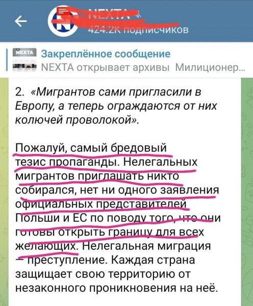 Сегодня было очень много работы и много спал. Поэтому не стану писать о ситуации на польской границе, да и не хочу. Там творится страшное, - фактов много, кому охота, смотрите на "Желтых сливах" фото и видео с мест, и эти факты могут оспаривать только напрочь зашоренные неадекваты, - но уроды из Варшавы пытаются спихнуть вину на Белоруссию, и перед вами один из главных их аргументов, озвученных беглой попкой. Черным по белому, важное подчеркнуто. И: