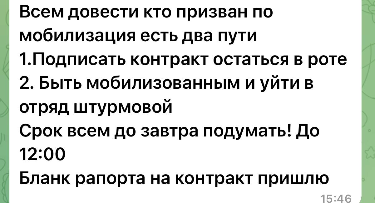 Что характерно, вот эта самая "агитация среди военнослужащих" всё также сводится именно к принуждению (цитирую): "Нас, остатки мобилизованных, под угрозой отправки в штурма заставляют подписывать контракты. Это не только в нашем полку так, в соседних то же самое" и "По требованию старшего начальника военнослужащие, отказавшиеся заключать контракты, будут переведены в пехотные подразделения, независимо от специальностей и занимаемых должностей". Т.е. помимо перспективы "окончательного решения вопроса" задолбавшихся мобилизованных и их семей (отдувающихся за ошибки государства и пятисотых кадровых ипотечников) путём навязывания им нехитрой вилки из законтрачивания или сливания в штурмах, имеем ещё и очередной пример наплевателького отношения к вопросу общей боевой эффективности подразделений - задача по законтрачиванию явно оказывается весомее, чем профессиональные навыки людей.