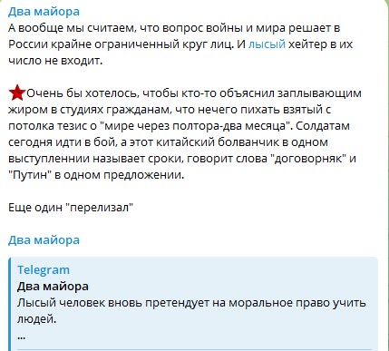 И он же вот выдал это в преддверии наступления ВСУ в Курской области? И наступление теперь будет еще более активно, потому что там знают, благодаря спикеру-хейтеру известного СМИ, что через месяц-два война закончится, а значит надо откусить у России побольше и чуть-чуть по времени удержать. А с нашей стороны в рядах могут начать думать о том, что смысл-то подставляться под пули, смысл-то упираться и помогать фронту дронами и связью, если через месяц-два все закончится?