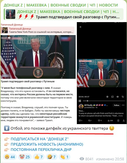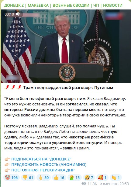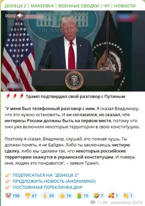 Поэтому я сказал, Владимир, слушай, это полная чушь. Ты должен понять, я не Байден. Либо ты заключаешь честную сделку, либо мы сделаем так, что некоторые российские территории окажутся в украинской конституции. И поверь мне, людям это понравится", – заявил Трамп.