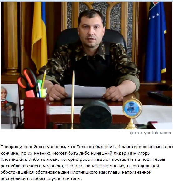Товарищи покойного уверены, что Болотов был убит. И заинтересованным в его кончине, по их мнению, может быть либо нынешний лидер ЛНР Игорь Плотницкий, либо те люди, которые рассчитывают поставить на пост главы республики своего человека, так как, по мнению многих, в сегодняшней обострившейся обстановке дни Плотницкого как главы непризнанной республики в любом случае сочтены.