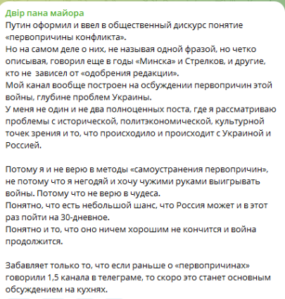 Когда обсуждают эти самые первопричины, в первую очередь смотрят на идеологию. Но она, в данном конкретном случае, вторична. Точнее даже не вторична, она рычаг. Рычаг для вталкивания масс в конфликт. Все это есть - комплекс младшего брата для поколений 50+, борьба города с деревней, а деревенский национализм он оглушительно победил город на Украине, ну и символизм в виде искажения исторической памяти с помощью национализма.