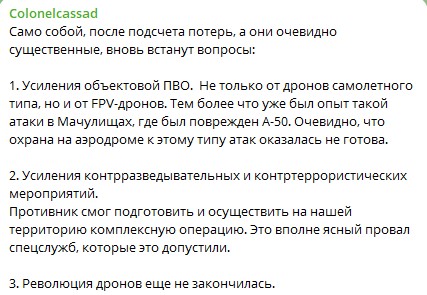 Вообще же произошёл провал во всех линиях: в работе контрразведки (не предотвратили), разведки (заранее не узнали), аэродромной охраны (стратегические бомбардировщики стоят под открытым небом без защиты) и много ещё где. Самый главный вывод: на тотальную войну противника необходимо ответить ровно тем же самым. Иначе мы эту войну проиграем.