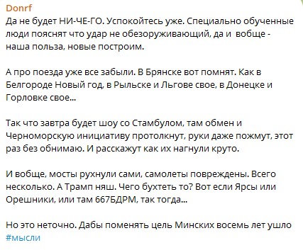 Ночь мрошла тише чем обычно. Говорю же - ничего не будет. Вот в Стамбуле прорыв возможен. Не на 30 дней, это попозже чуть, но по Черному морю. Если партнёры не нагадят прямо. А вот удары....
