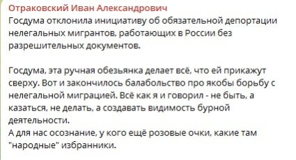 Бодро так, целый главный начальник по миграции в РФ, нам рассказывает, что только около половины иностранцев прибывает с трудовой целью. А остальные что здесь делают? Целых три миллиона, семьсот тысяч из которых вообще с нарушением миграционного законодательства. При чём они плотно сидят на наших социальных пособиях и выплатах, пользуются медицинским обслуживанием и образованием. И тут же власть в лице правительства отклоняет инициативу выдворения нелегалов, типа дорого. Так зачем вы тогда их завозите? Очевидно, по нашу душу.