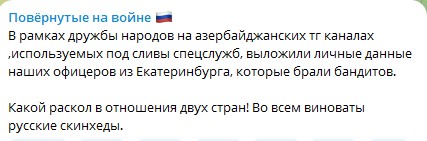 Азербайджанские тг каналы сливают данные русских офицеров из Екатеринбурга. Если Кремль сейчас не встанет на сторону своей собственной силовой машины - это будет фатальная ошибка с очень тяжелым последствиями для страны.