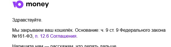 НКО "ЮМани" в одностороннем порядке разорвало соглашение, закрыло кошельки, заблокировав средства и сообщило, что повлиять на это решение нельзя!