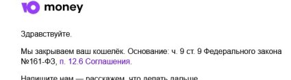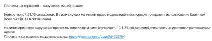 В итоге, не разобравшись, "изумительные "специалисты НКО "ЮМани" заблокировали наши кошельки в одностороннем порядке разорвав соглашение, без возможности изменения этого решения, якобы за нарушение каких то их правил и одним моментом закрыли кошельки и только после уведомили, что разорвали соглашение, крысы, одним словом.