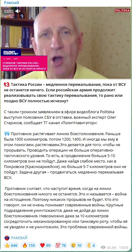 2)* Относительно заявления "ТГ-канала Рамзай" (кажется, это старинная интернет-шлюха В. Шурыгин?), ссылающегося на некоего "отставного полковника СБУ" — о том, что "современная война на истощение исключает возможность прорывов" (и т. п. бред) — я рекомендую перечитать басню Лафонтена "Лиса и виноград". Конкретно: если у "этих" (увы! "Эти" — это мы…) не получилось ничего "в прорывы", то это совершенно не значит, что надо убеждённо-непреклонно избивать собственную армию в непрерывных лобовых штурмах в надежде на то, что "вражеская армия кончится раньше". Напоминаю, что нечто подобное ("хорошо забытое старое") уже предложил (и реализовал!) фельдмаршал фон Фалькенгайн в 1916 году, решивший "перемолоть" французскую армию в сражении под Верденом. Результат известен — "перемололась" как раз армия 2-го Рейха (хотя и французы тоже — "по шею в крови ходили"), а исход войны, в итоге, решили (на оперативном и стратегическом уровне) две основные вещи: 1) колоссальное военно-экономическое превосходство Антанты над "Четверным союзом" после вступления в войну США (на стратегическом уровне); 2) новый (и недооценённый Генштабом Германии) вид оружия — танки (на оперативном уровне, т. к. решали задачу "средства прорыва").