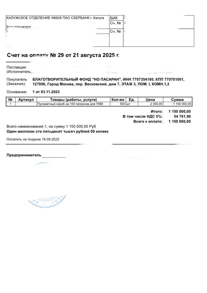 За пулемётные коробы пришел новый счёт. Наша текущая задолженность увеличилась и составляет сумму = 4 741 700 ₽