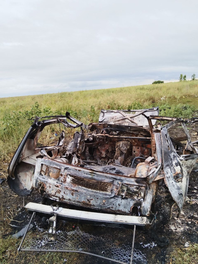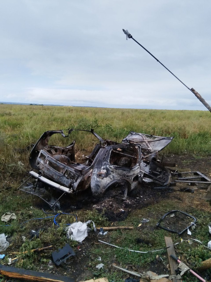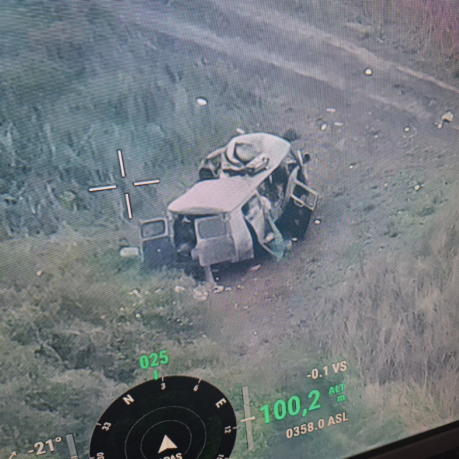 А дело было так. Подвоз продуктов на опорники в Пограничье штука веселая. Волонтерский УАЗ/Нива/иномарка, погрузка и поехали. Если не будет ФПВ, сбросов, миномета, то привезут. Воду, еду, патроны... В обратку часто эвакуация или же просто - тому к врачу, тому в штаб, тому еще чего... Два человека. За рулем и с автоматом. Вот и тот раз так. Поехали. Не повезло. Четыре ФПВ. Итог на фото, хохлы оказались косорукими. мужики выскочили, доложили. Три колеса минус. с бака вырвало пробку и полыхнуло, к счастью почти без пожара. Хохлы птицей смотрят.