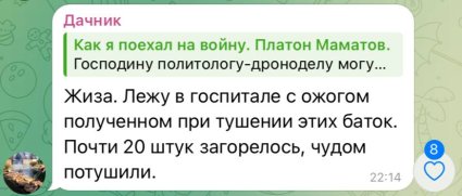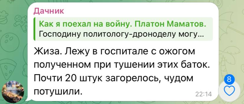 Есть блиндажик. В блиндажике сидит шесть человек. Мужья своих жен, отцы своих детей, сыновья своих родителей. Ценные военные специалисты, у каждого по личному кладбищу за плечами. А еще в блиндажике полно взрывчатых, горючих и выделяющих при горении токсичные вещества материалов.