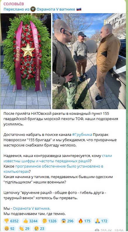 На медийное прикрытие облажаний и продвижение деструктивных нарративов в самую первую очередь работают топовые медийные глашатаи, включая самого Соловьёва, у которого, в частности, на канале всё также продолжает висеть мерзейший репост "Охраноты": https://t.me/SolovievLive/329872?single